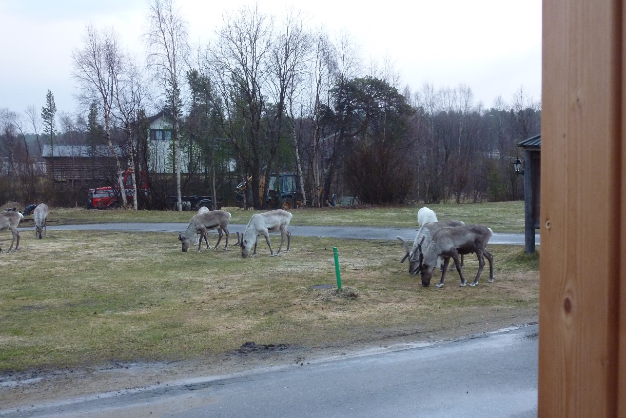 Während wir angeregt plauschen, kommt eine ganze Herde Rentiere, Bullen und Kühe direkt bis etwa 10 Meter vor den Bauwagen getrabt und äsen das kurze, graubraune Gras vom letzten Jahr auf den Stellflächen ab.