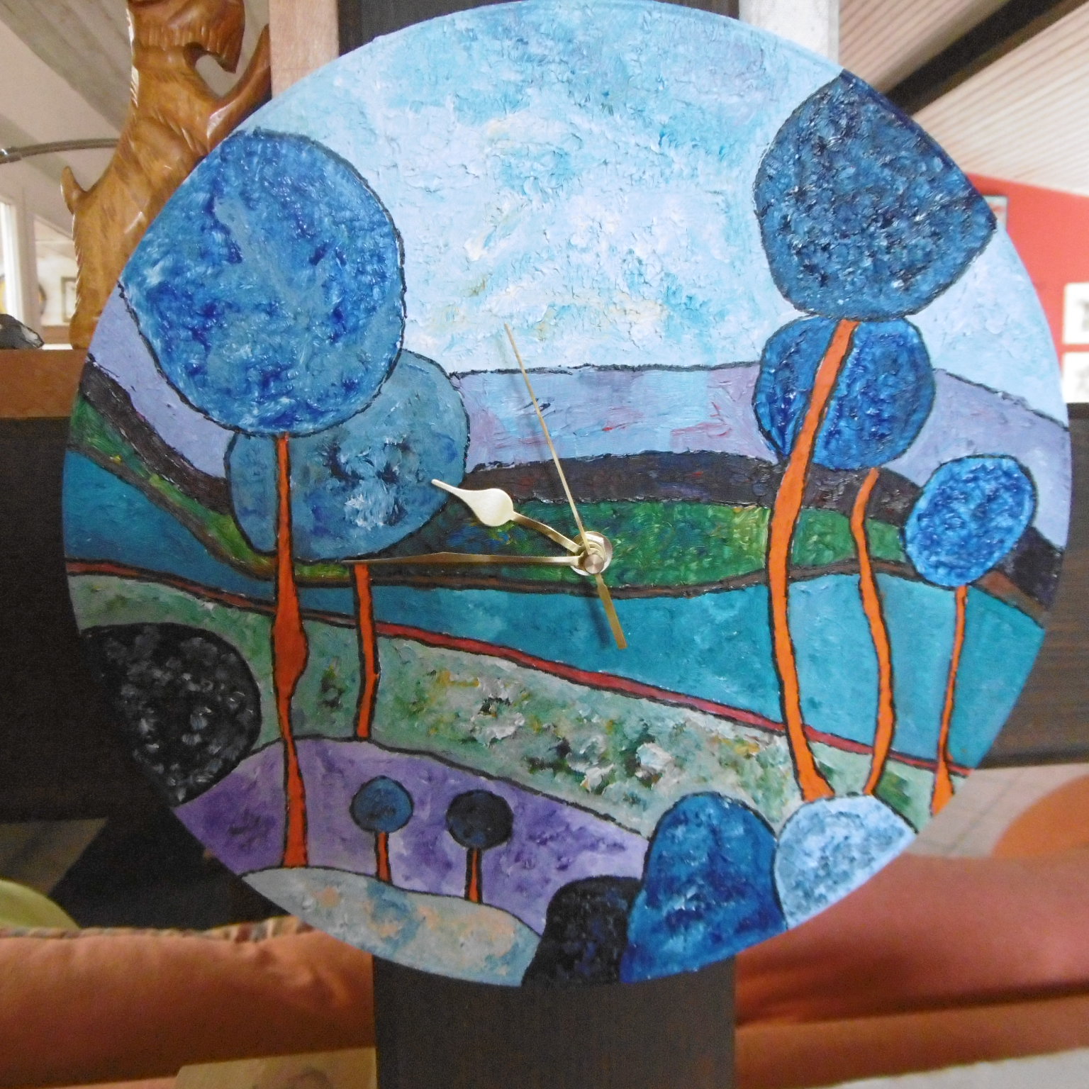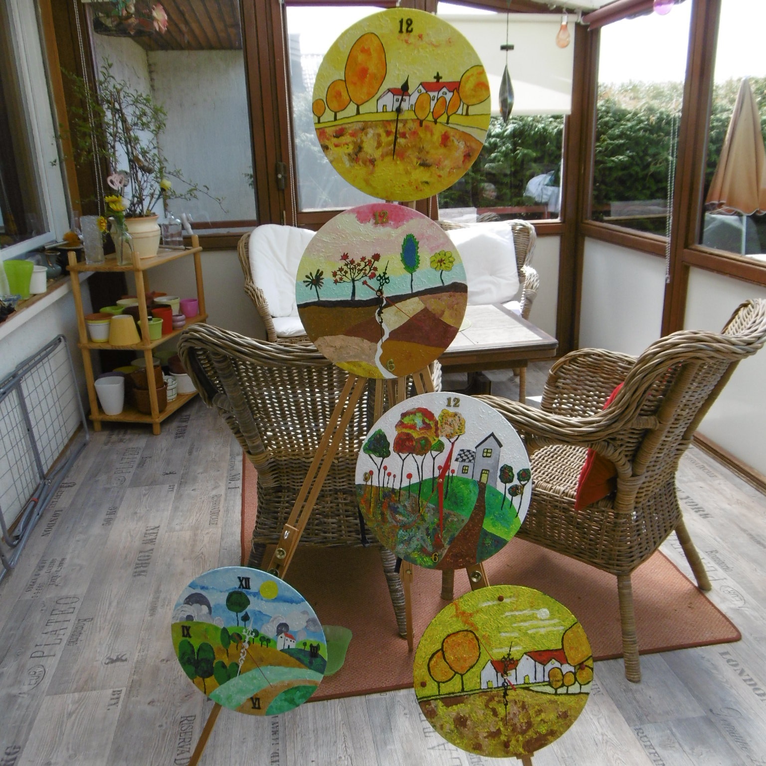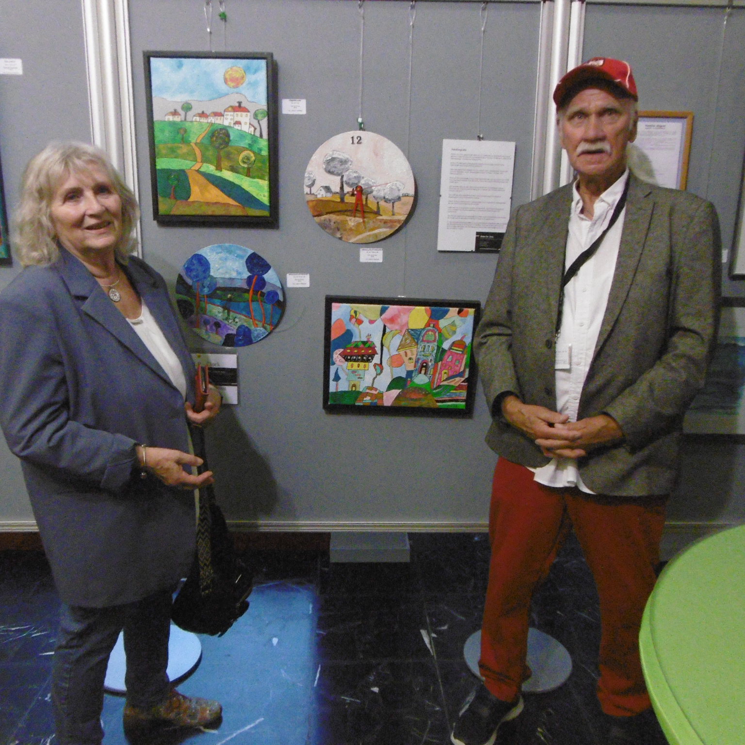Jedes Mitglied hatte eine eigene Stellwand, so auch ich und so konnte ich zwei naive Gemälde und zwei bemalte LP-Uhren ausstellen.