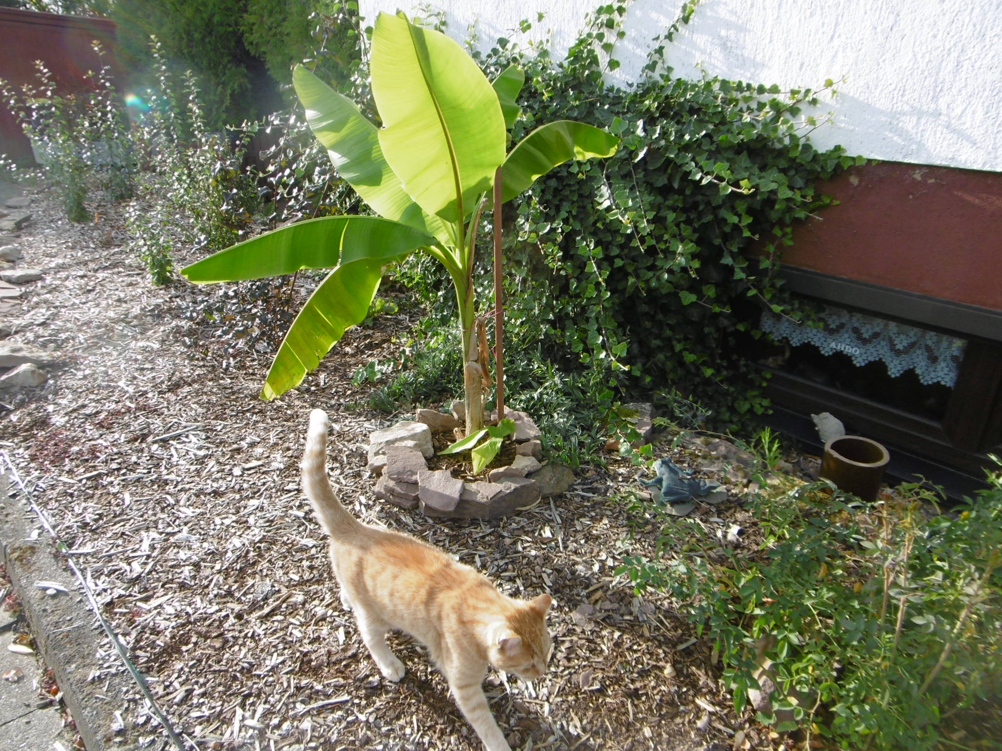 Im sonnenverwöhnten Juni brachte mir mein „pflanzenaffiner“ Bruder, der in Bremen zuhause ist, einen schön gewachsenen Ableger einer bei ihm im Ziergarten stehenden Bananenstaude mit, die wir sorgfältig auf einer Rabatte vor unserem Haus einpflanzten.