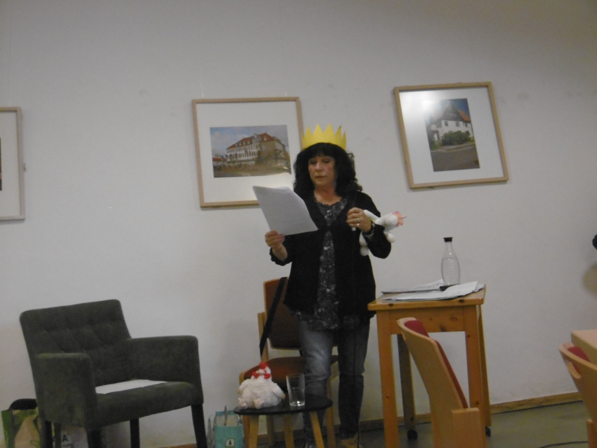 Sie las aus ihrem zweiten Buch sehr persönlich gehaltene Kurzgeschichten, die sie mit mitgebrachten Requisiten und Musikstücken aus ihrem Smartphone erfolgreich untermalte.