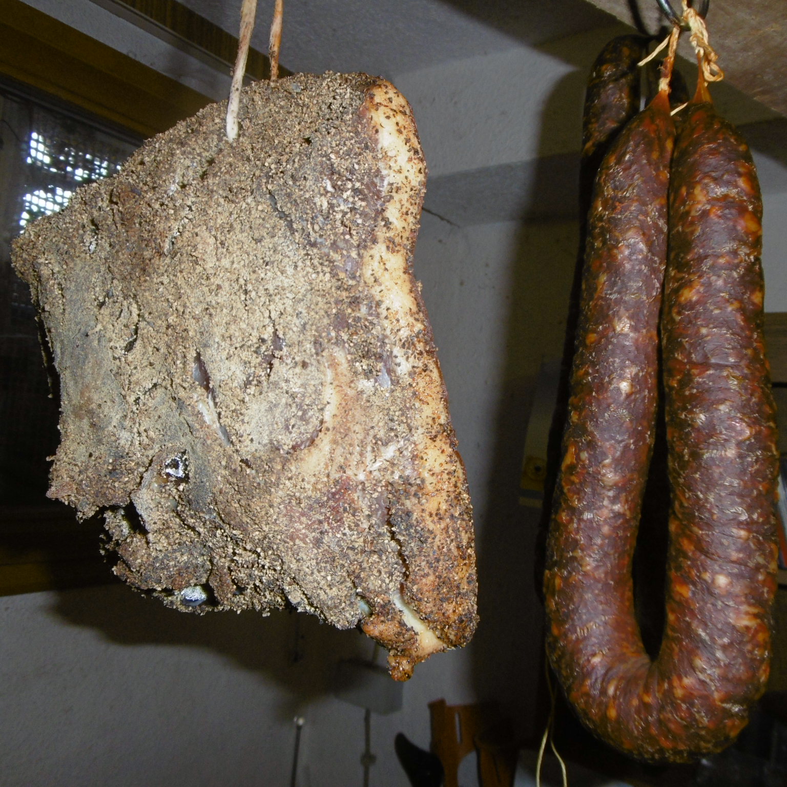 Schinken wie auch Wurst (ungarische „Stracke“) werden nun bis Ende April in einem kühlen Nebenraum unseres Hauses reifen.